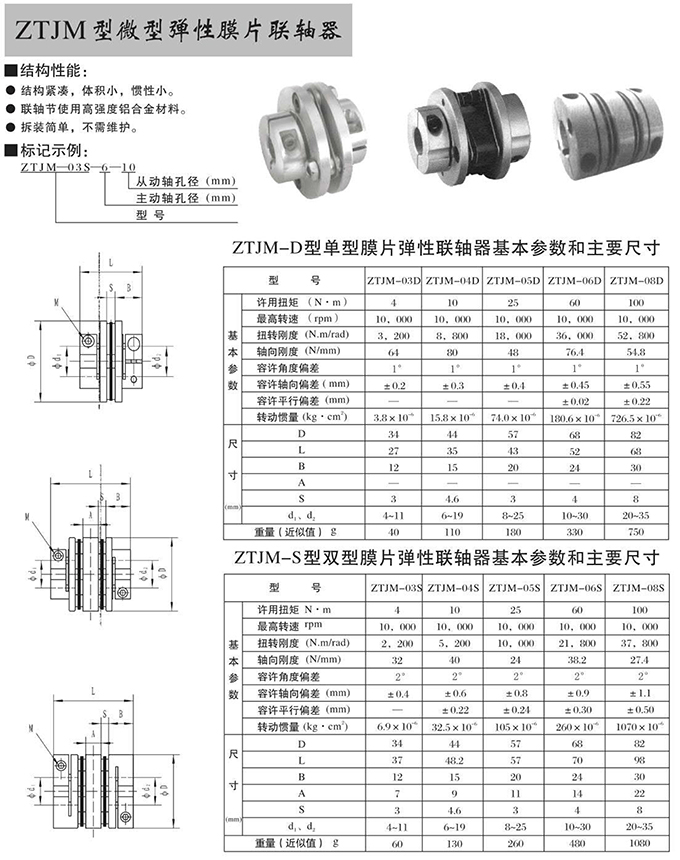 瑞安市寶德隆機械配件有限公司提供ZTJM型微型彈性膜片聯軸器具有拆裝方便,快速安裝等特點,廣泛用于連接/固定輪轂孔和零件的軸,例如齒輪,錐齒輪,鏈輪,葉輪,凸輪,皮帶輪和飛輪等軸的聯結固定,咨詢電話:18906872378