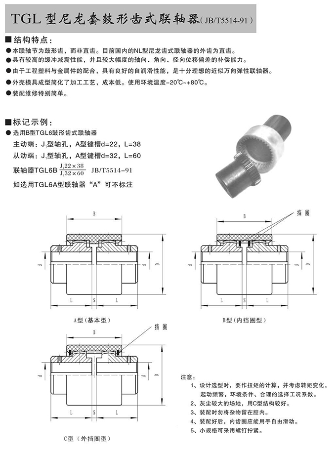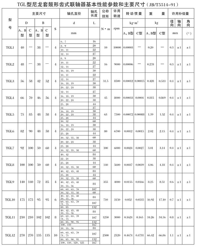 瑞安市寶德隆機械配件有限公司提供TGL型尼龍套鼓形齒式聯軸器具有拆裝方便,快速安裝等特點,廣泛用于連接/固定輪轂孔和零件的軸,例如齒輪,錐齒輪,鏈輪,葉輪,凸輪,皮帶輪和飛輪等軸的聯結固定,咨詢電話:18906872378